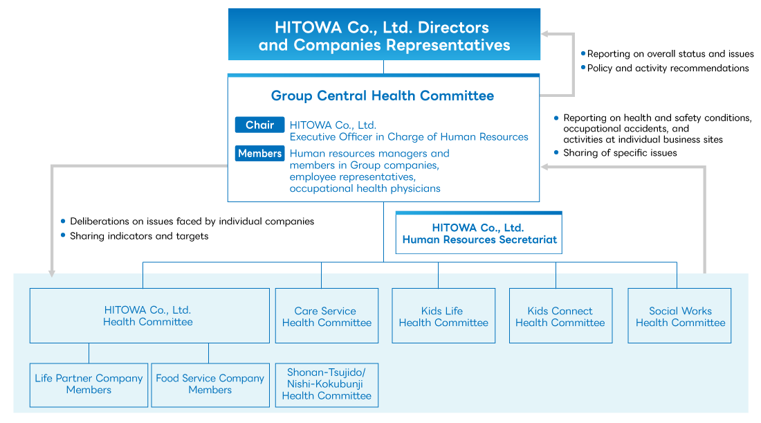 The HITOWA Group holds meetings of the Group Central Health Committee, which is chaired by the Executive Officer in Charge of Human Resources at HITOWA Co., Ltd., which is responsible for managing the health and safety activities of the Group as a whole.