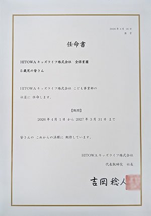 画面越しに吉岡社長から任命書が読み上げられ、各園では園長・担当者から任命書を園児一人ひとりへと手渡されました。