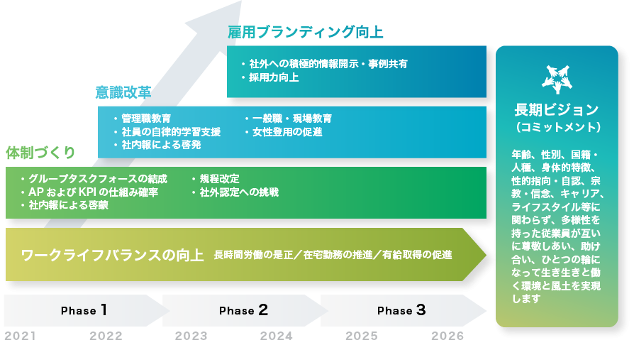 多様な事業を通して、人によるサービスを提供する会社だからこそ、さまざまな属性や特性を持つ従業員一人ひとりが最大限にその能力を発揮し、活き活きとやりがいを感じて働ける会社となることが不可欠です。