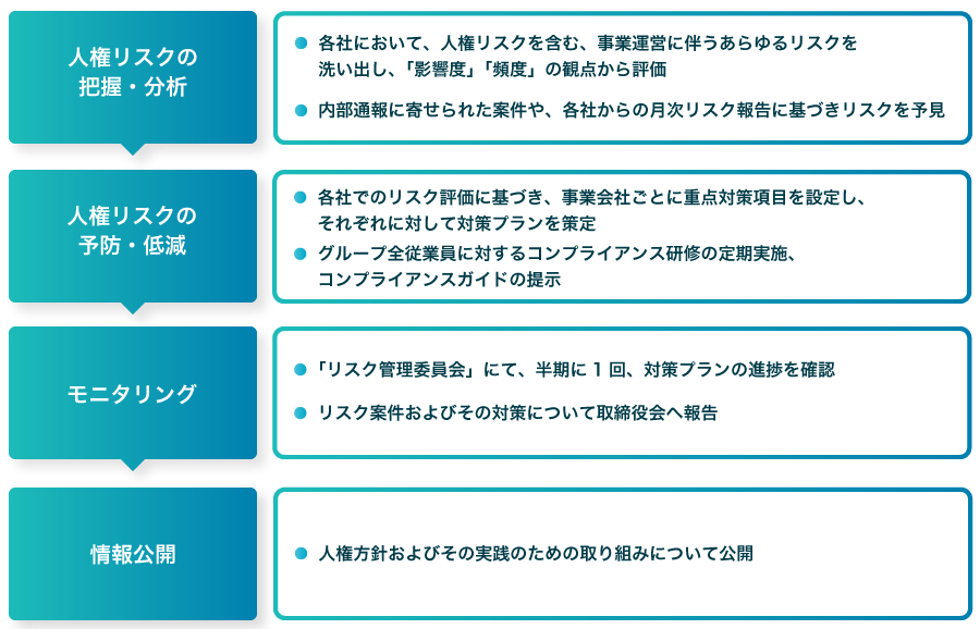人権リスクを含む、事業運営に伴うあらゆるリスクは、全グループで洗い出され、取締役会の下に設置されている「リスク管理委員会」の中で報告・共有されています。同委員会では、それらリスクの評価、対策プランの策定とその進捗フォローも行っています。 また、コンプライアンス・ホットラインや関係部門からの通報により、コンプライアンス案件となる人権問題が明らかになった場合は、社内規定に従って申し立て処理を行っています。